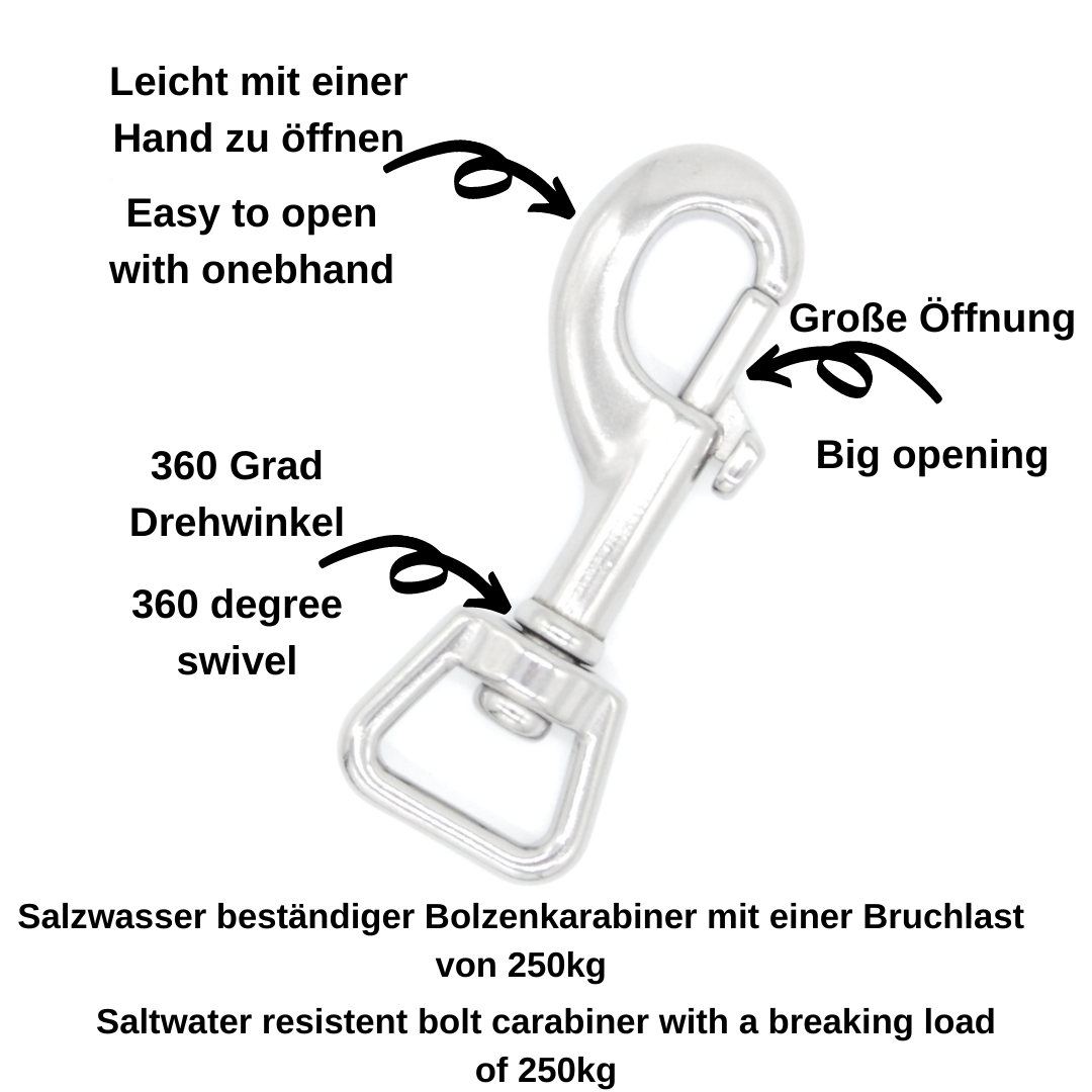| Karabiner Art: | Edelstahlkarabiner (Salzwasserbeständig) |