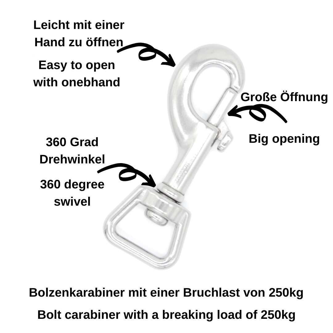 Du hast die Wahl zwischen dem folgenden drei Karabinern, welche alle nickelfrei sind und einen 360 Grad Drehwirbel aufweisen. Der Drehwirbel ermöglicht es Dir Deinen Hund schnell und einfach anzuleinen und sorgt außerdem dafür, dass sich die Schleppleine nicht in sich verdreht.